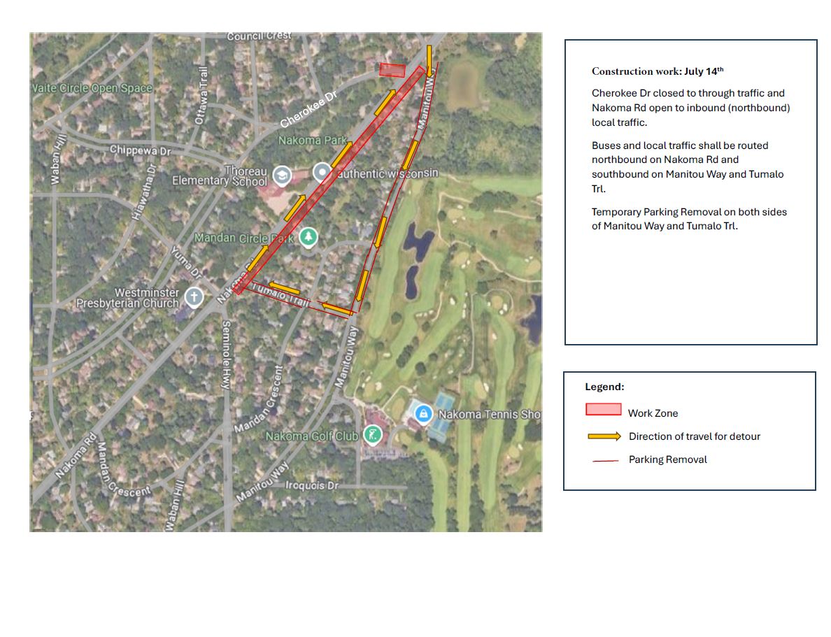 Construction has begun on the Nakoma Sidewalk. See below for the Phase 1 traffic control layout, expected to be in place through mid-August